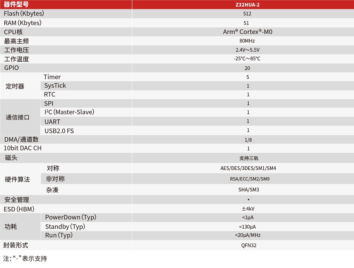 Z32HUA-2系列安全芯片采用32位高性能Arm® Cortex®-M0安全核,采用AMBA多总线结构实现。片上集成了4KB高速Cache、48KB SRAM、3KB PAERAM和512KB Flash。芯片内置的硬件算法协处理器提供性能优异的DES/3DES、RSA、ECC、SM2、SM1/SM3/SM4、SHA-1/SHA-256/SHA-512安全算法和真随机数发生器。芯片自带DA转换模块,拥有USB2.0 FS、SPI、7816、I2C、UART、有线/无线音频接口、磁条读接口等各种通信接口。芯片通过EAL4+安全认证。